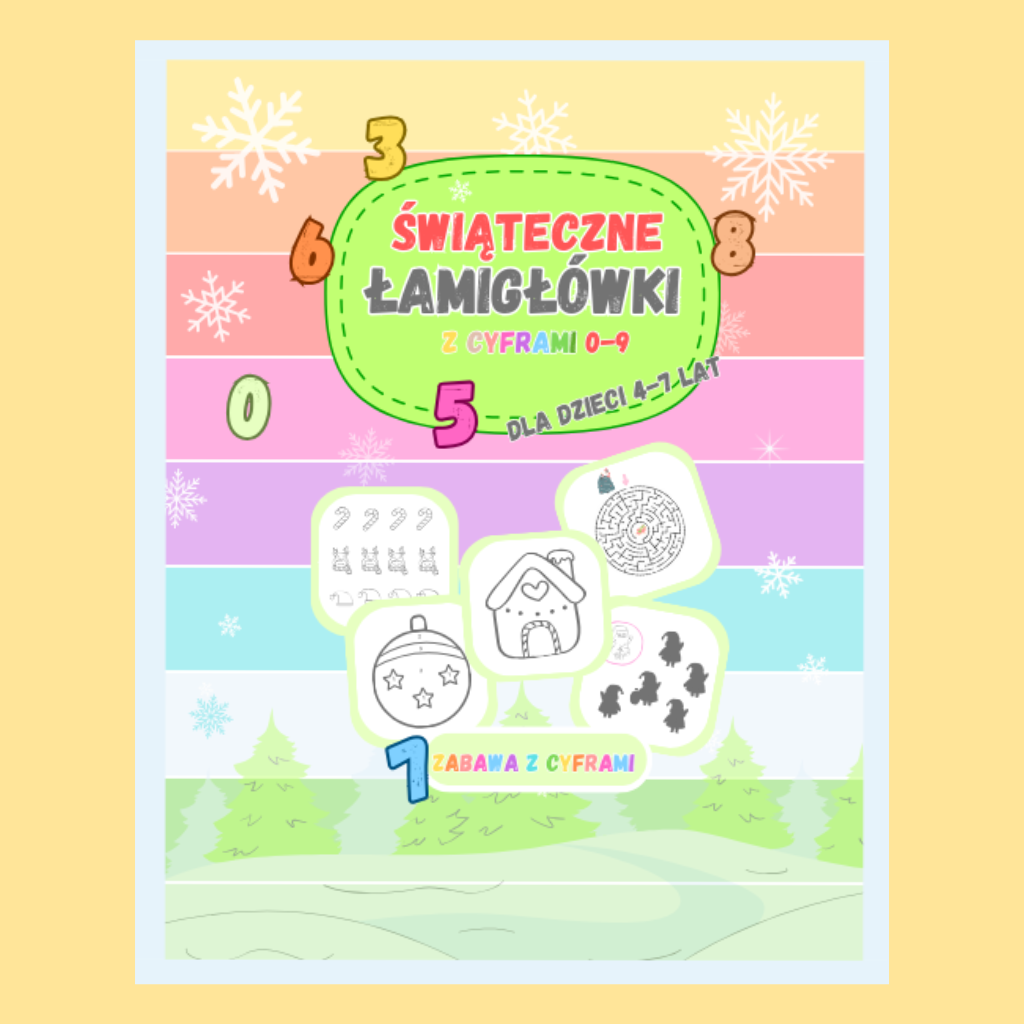 Znajdziecie w niej zadania i świąteczne łamigłówki do każdej cyferki od „0-9” takie jak: